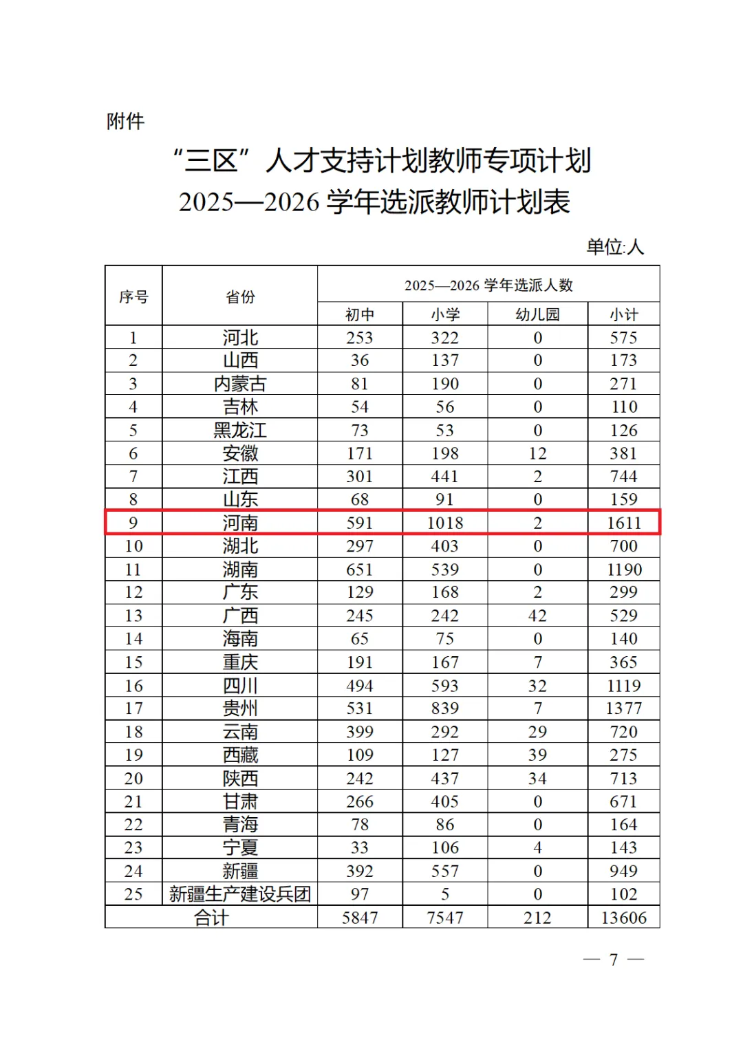近日,教育部、财政部近日联合印发《关于做好2025年“三区”人才支持计划教师专项计划有关实施工作的通知》(以下简称《通知》)。按照通知,2025—2026学年度全国计划选派13606名教师到“三区”(边远贫困地区、边疆民族地区和革命老区)支教,其中河南计划选派1611名教师(初中591名、小学1018名、幼儿园2名)。