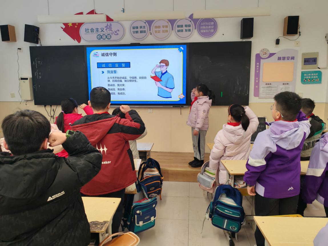 讨论环节,同学们积极发言,分享自己对诚信的理解和在期末考试中践行诚信的决心。一位同学说:“期末考试是对我们学习成果的检验,我们要靠自己的真实水平取得好成绩,不能弄虚作假。诚信考试不仅是对自己负责,也是对老师和家长的尊重。”还有的同学提出了在考试中互相监督、共同遵守考试纪律的建议,得到了大家的积极响应。