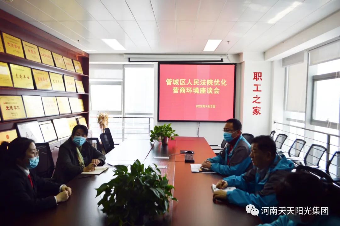 按照省、市关于“万人助万企”活动工作要求,郑州市中级人民法院工作部署,着力优化营商环境,坚持问题导向、目标导向和结果导向,聚集企业发展重点难点堵点痛点问题,结合“能力作风建设年”活动,4月2日上午,郑州市管城区人民法院宋静等一行两人,来到河南天天阳光集团进行调研座谈,集团公司董事长王瑜、副总裴海民、孙艳霞,李明参与座谈。